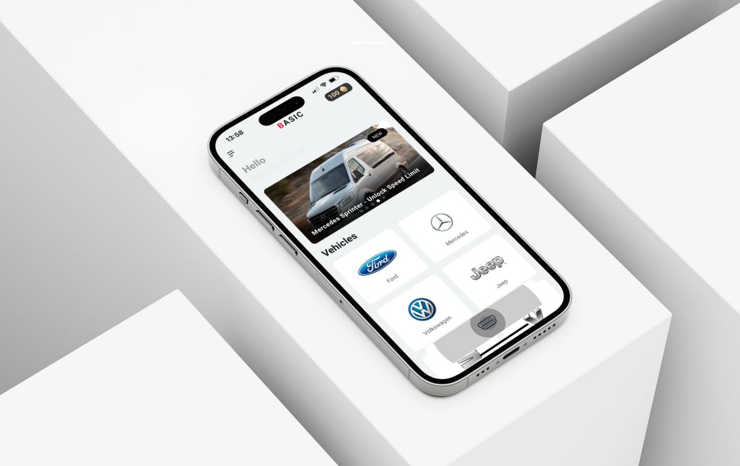 Il suffit d’insérer l’appareil OBD Coding Pro dans le connecteur OBD-II de votre véhicule, d’ouvrir l’application BASIC et de l’appairer via Bluetooth. L’application détecte automatiquement votre voiture et affiche la liste des fonctions compatibles. Vous pouvez ensuite débloquer les fonctions souhaitées en utilisant vos Basic Rings — les crédits intégrés à l’application — d’un simple toucher.